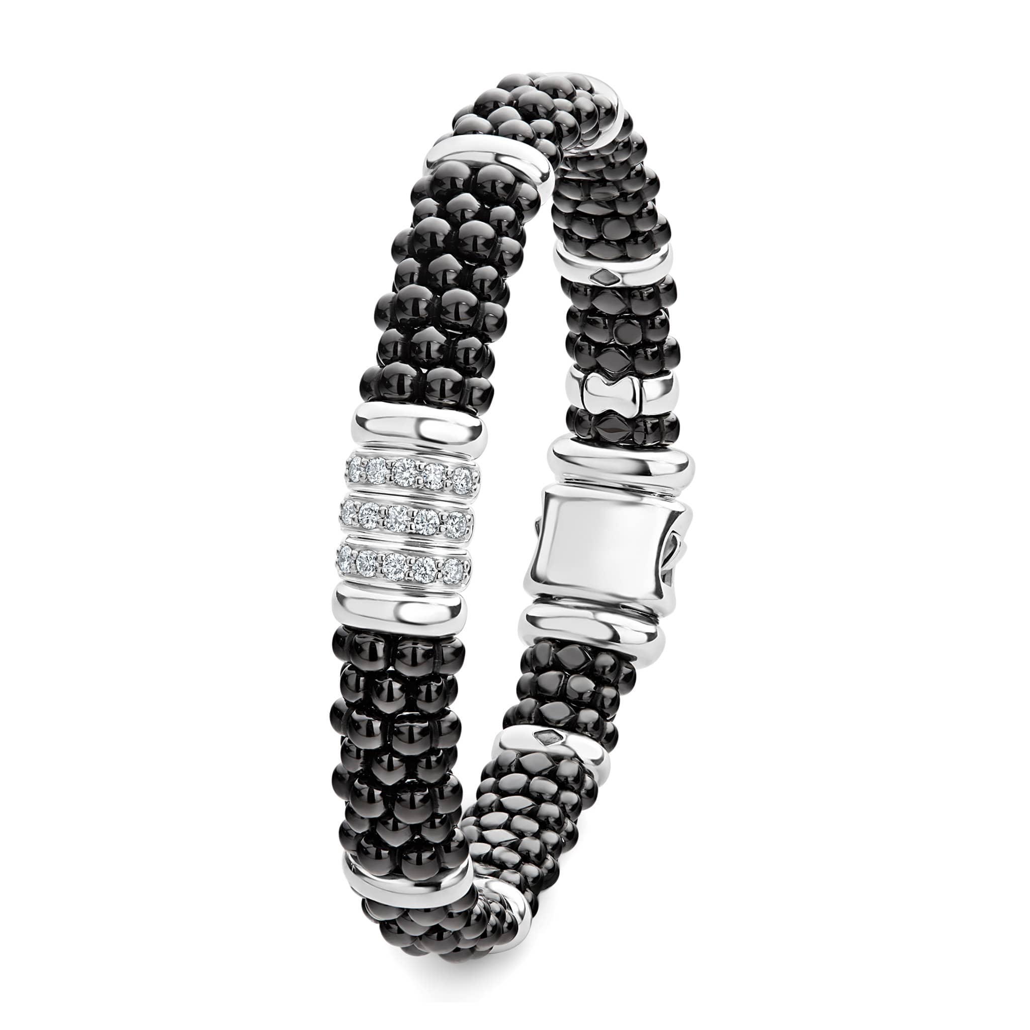 Three diamond stations set in sterling silver surrounded by black ceramic Caviar beading. LAGOS diamonds are the highest quality natural stones.