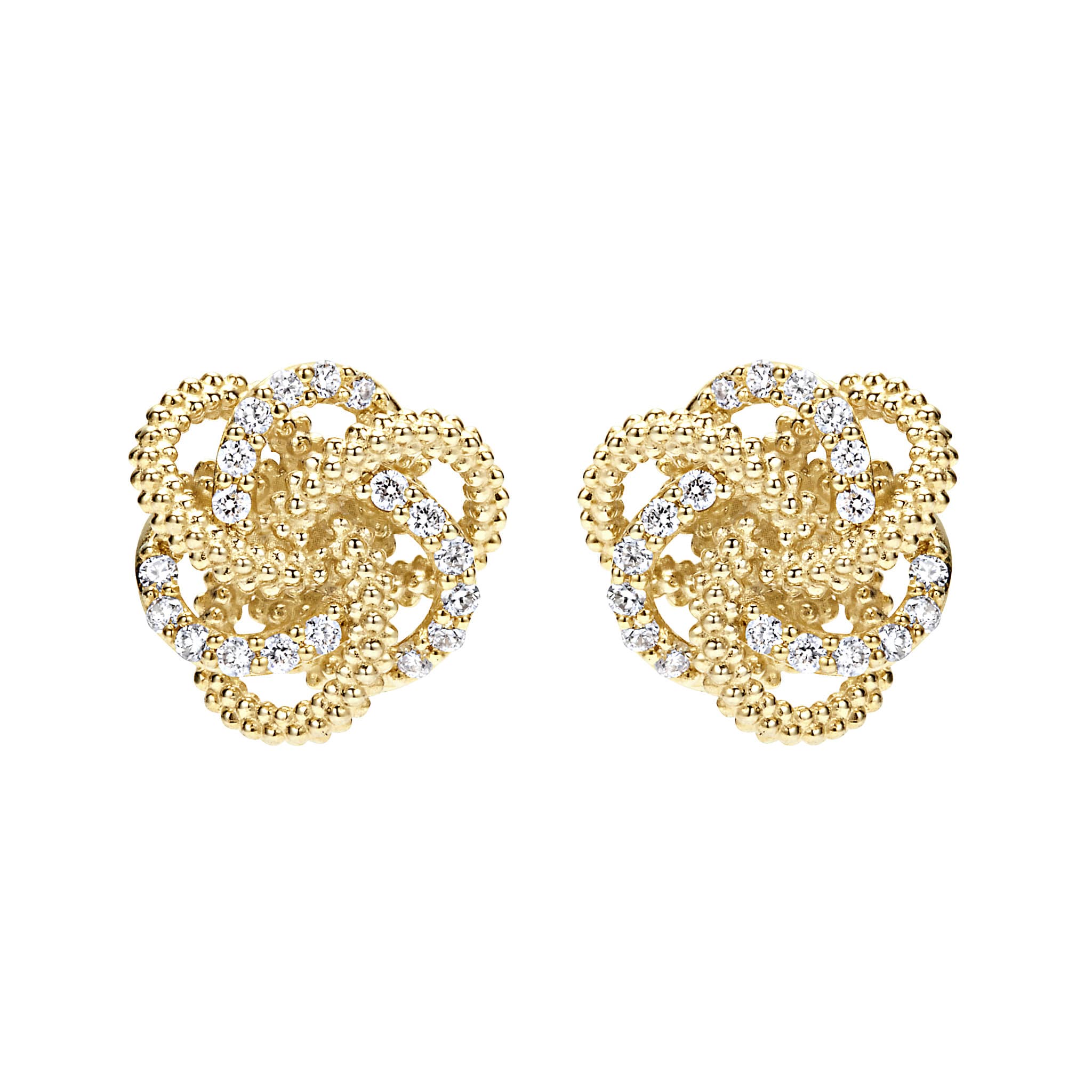 Love knot stud earrings formed of diamonds and 18k gold Caviar beaded bands. LAGOS diamonds are the highest quality natural stones.