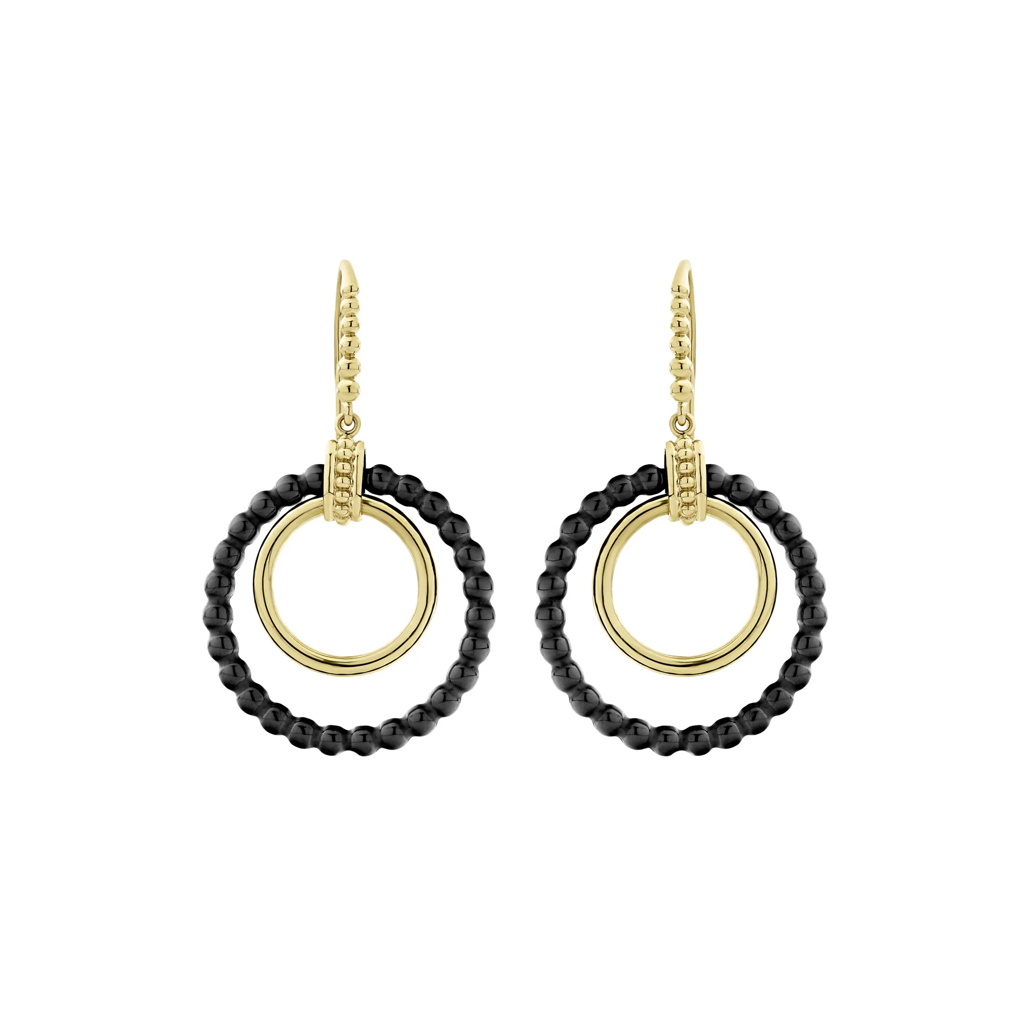 Double circle drop earrings with smooth 18k gold and black ceramic.
