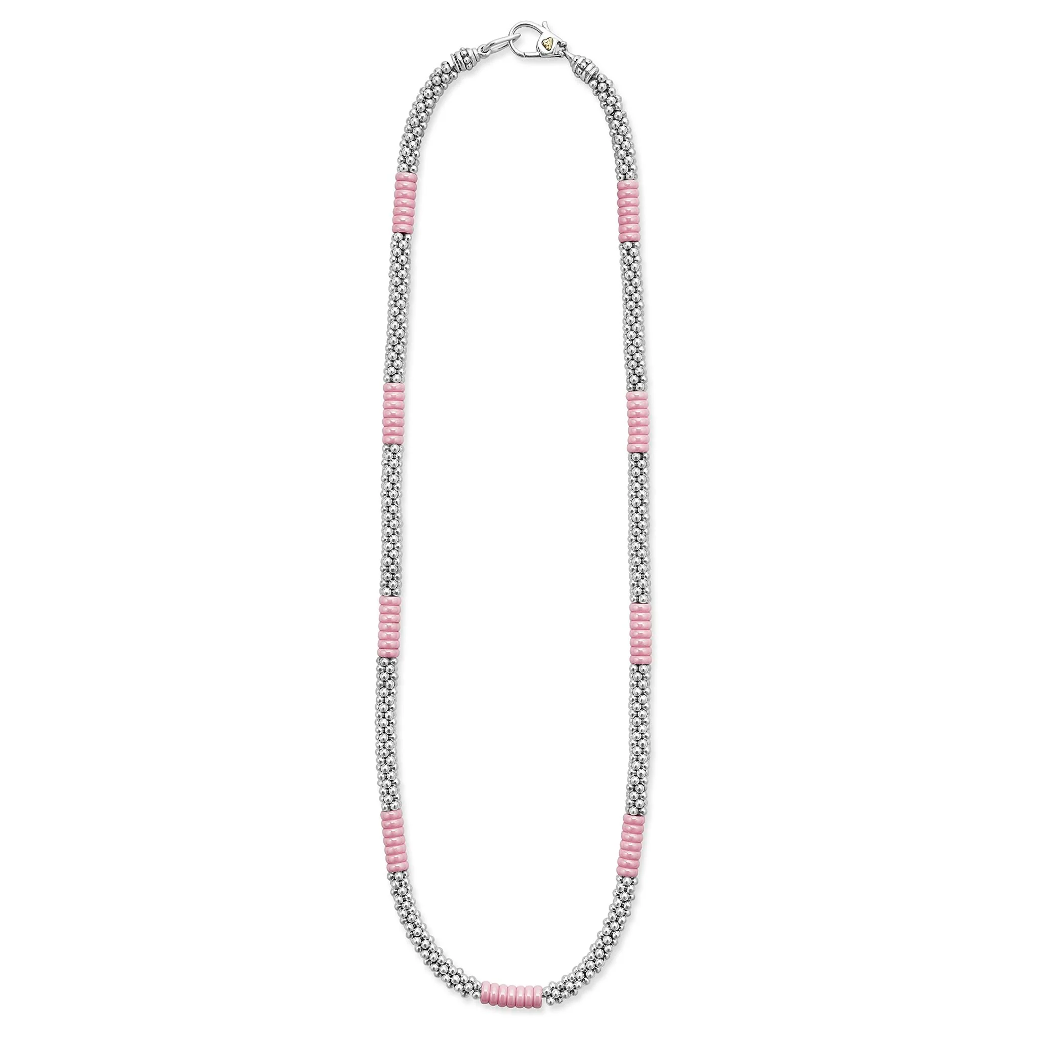 Elevate your collection with the Sterling Silver and Pink Ceramic Station Necklace. Luminous pink ceramic Caviar beads are accented with polished sterling silver stations and finished with a signature lobster clasp for a secure, refined fit. Sophisticated and distinctive, this designer necklace delivers modern luxury whether worn alone or layered with intention.