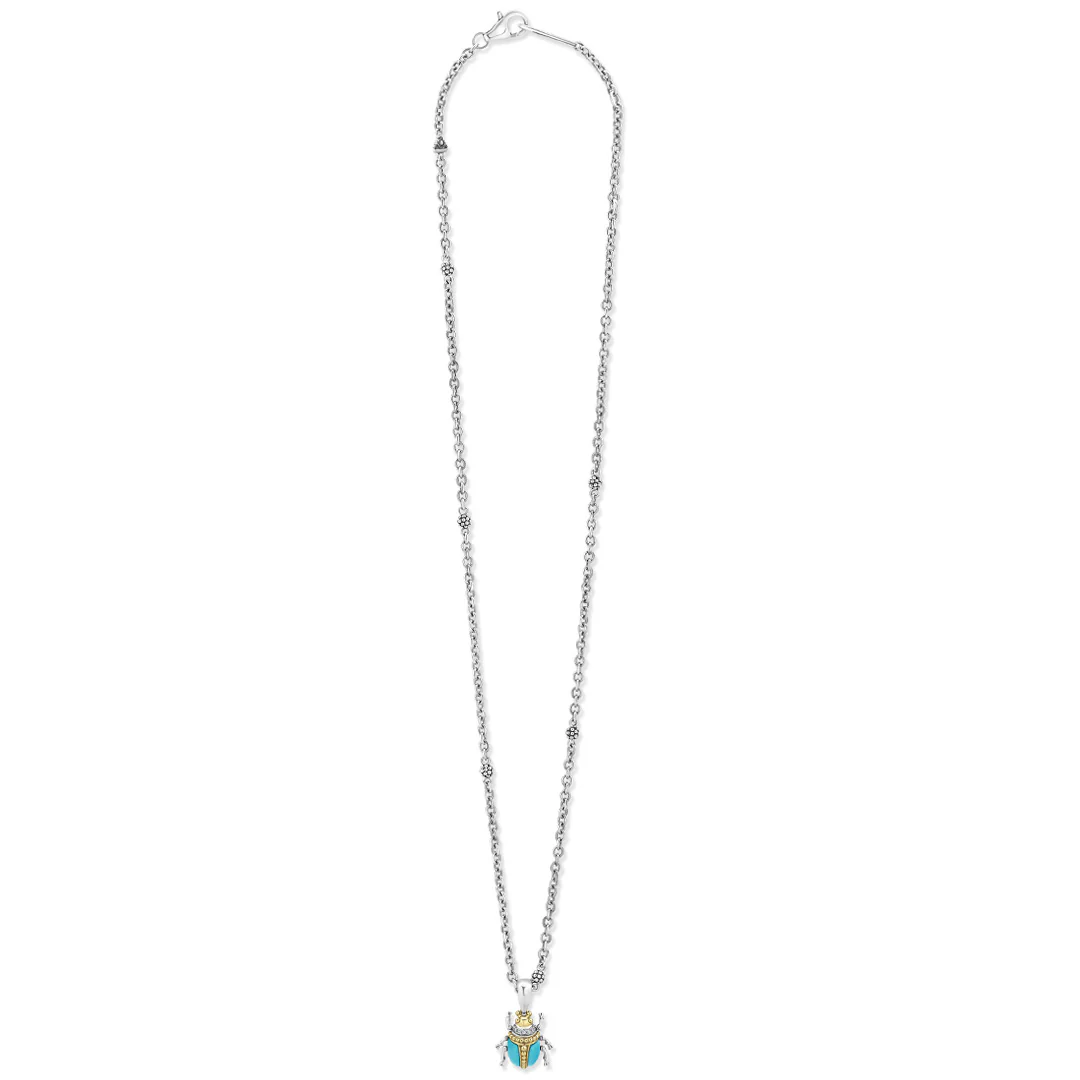 A LAGOS exclusive. Turquoise with diamond, 18K gold and sterling silver accents forming a beetle pendant.